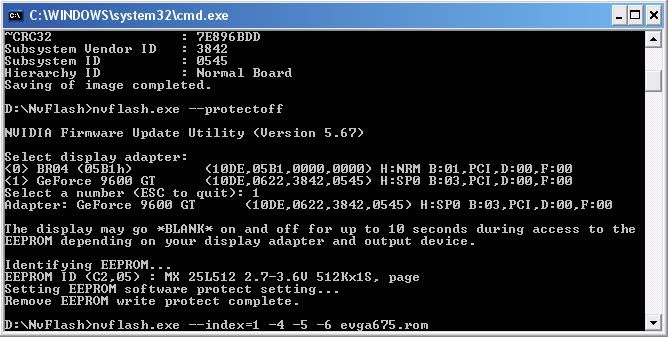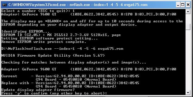 Mine is #1 so I will type mine as such. "nvflash.exe --index=1 -4 -5 -6 evga675.rom" Just use your card number and your filename.rom.