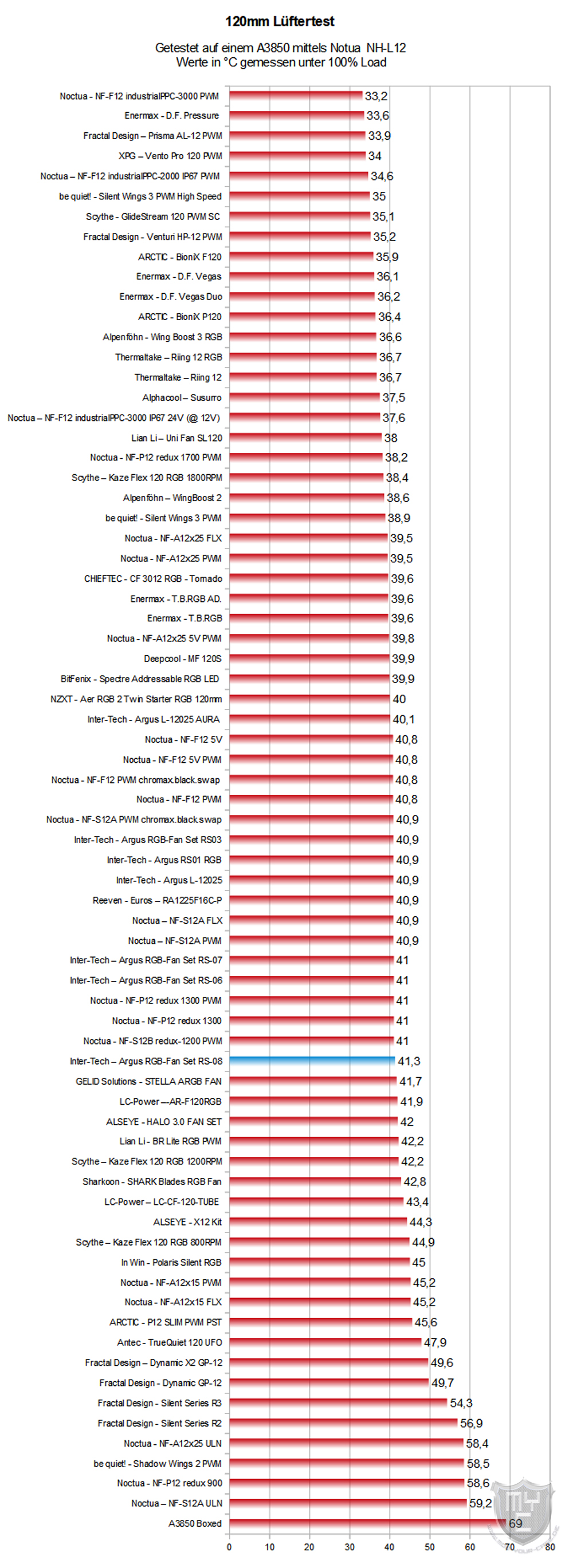 NF-A12x25 example versus Arctic Bionix P120 (40.9 - 44.4 temps, 35.5 - 38.9 dB )