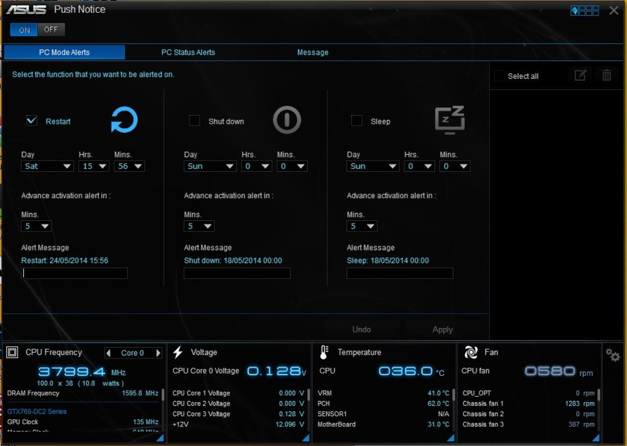 Power supply voltage and CPU package temp warnings can also be set to trigger an alert message to the paired remote device.