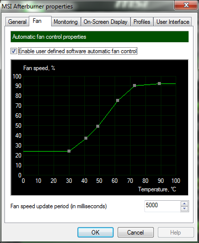 Both cards use the same Afterburner fan speed vs temp graph: